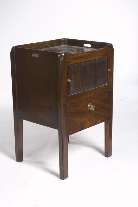 the tray top with inlet handles above a tambour door and sliding commode drawer, on square tapering legs, requiring restoration