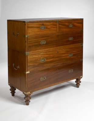 made in two sections, the banded top above the short over three long graduated drawers with recessed brass handles and corner mounts, the sides with brass drop carrying handles, on short turned feet