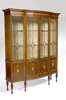 of serpentine form, the projecting cornice with faux flutes and vine scrolls interspersed by roundels above four glazed doors with ogee astragals enclosing glass shelves and four panel doors decorated with ribbon-tied paterae, the whole highlighted with abalone shell inlay, on turned and fluted baluster legs
