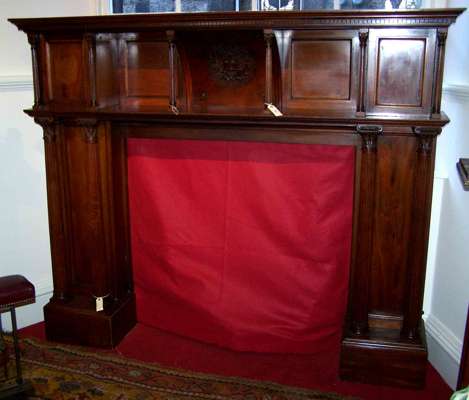 of architectural form, the mantel with dentil cornice above an undershelf on five fluted Corinthian columns centred by a carved armorial style panel depicting a stylised castle and inscribed with the date 1894, flanked by button release 'secret' cupboards at either end, the panelled jambs on double Corinthian column supports, each on moulded plinth base