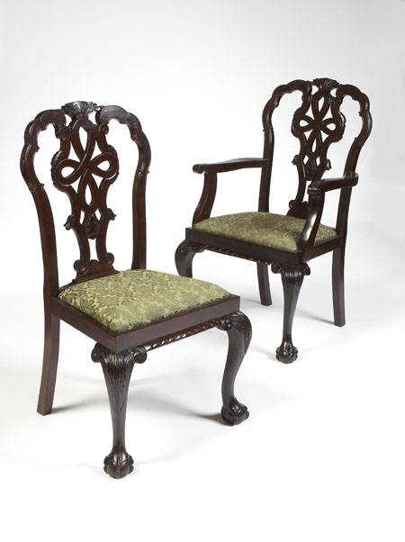 in the Chippendale manner, the rounded rectangular scroll framed backs with pierced entrelac splats above drop in seats on gadrooned rails, on leaf carved cabriole legs with claw and ball feet, including two armchairs (12)