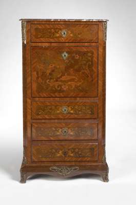 the rouge marble top above a frieze drawer and fitted writing fall over three drawers between canted canted uprights on skirted apron and bracket feet, the whole with gilt metal mounts and escutcheons