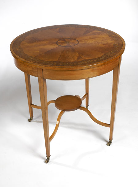 in the Sheraton manner, the radially veneered top with smaller repeated radially veneered centre enclosing a penwork flowerhead, the outer border decorated with harewood and penwork arabesques, the plain frieze with narrow crossbanded edge on slender square tapering legs united by an upswept circular undertier on brass socket castors, the whole decorated in box and ebony lines