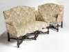 in the William & Mary taste, the arched rectangular backs with outscrolling arms above stuffover seats with undulating aprons, on ribbed inverted baluster legs with corrugated blocks united by pierced serpentine cross stretchers with leaf carved boss finials, on bun feet upholstered in 'rainbow' tapestry and yellow loose covers with red piping