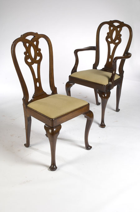 in the George II manner, the waisted backs with entrelac splats above drop in seats with caddy moulded rails, on plain cabriole legs with pad feet, including two armchairs (8)