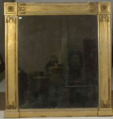 the broad rectangular frame applied with double stems of inscrolling lotus heads between sunken field leaf carved paterae to the upper corners, on moulded plinth base