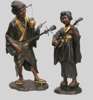 standing holding a shamisen in one hand and a sheet of music in the other, with a lantern over his shoulder, highlighted with gilt and copper decoration,signed in gilt to the base, 38cm high; and a companion figure, of a lady, playing a shamisen, incised signature, 35cm high (2)