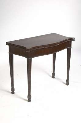 the serpentine top decorated with boxwood lines, with moulded edge and baize inset, above plain frieze, on stop-fluted square tapering legs with moulded block feet