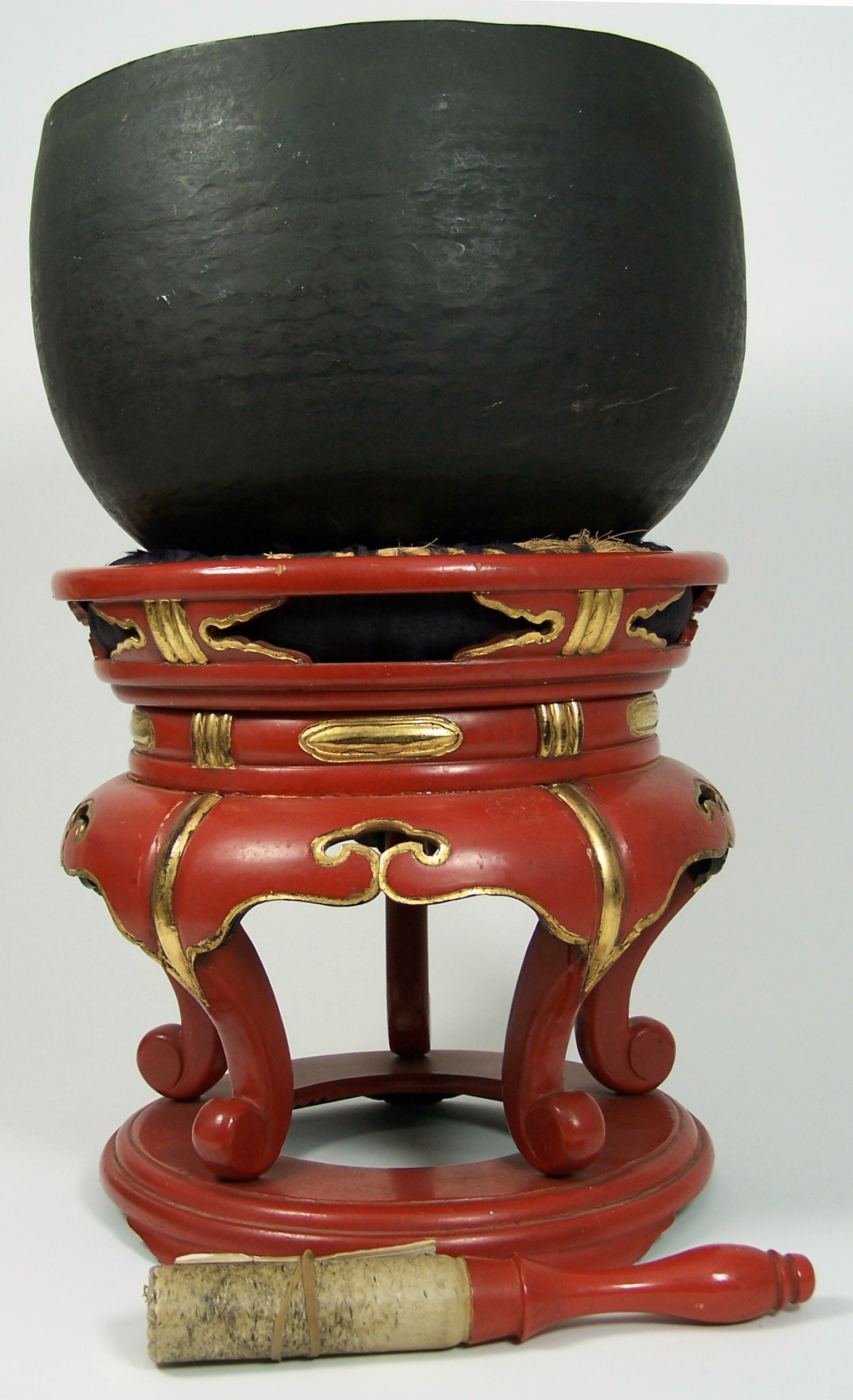 with red lacquer handled beater, and similar red laquer and gilt decorated stand, on four scroll feet