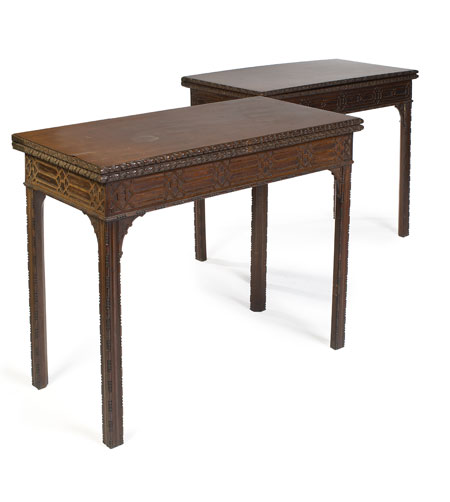 each top with floret carved edge, one with baize inset, the other with leather inset, above concertina-action blind fret carved frieze on moulded and bead-and-reel carved chamfered legs, headed by angle frets; one 92cm wide, 74cm high, 45.5cm deep, the other 91cm wide, 74cm high, 45.5cm deep (2)