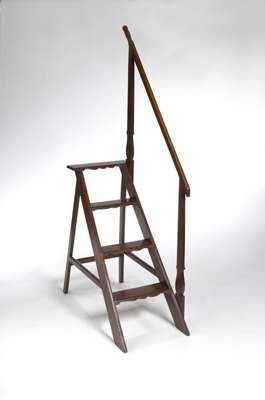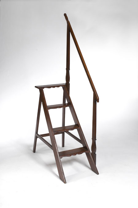 the four graduated treads with shaped aprons on a trestle stand united by stretchers, flanked by a shaped hand rail