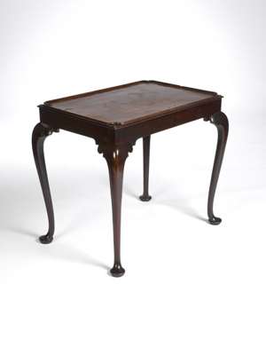 the rectangular tray top with moulded edge and re-entrant corners carved with florets, the plain shaped frieze above scroll carved cabriole legs, on pad feet