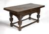 in the Flemish taste, the flanked top with pull out leaves at either end and above a channelled frieze with central fluted tablet and four gadrooned and under bulb turned legs headed by tablets and fluted capitals on bun feet united by perimeter stretchers