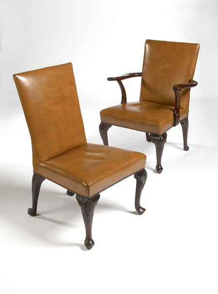 the arched rectangular backs above stuffover seats, on shell-carved cabriole front legs, and outswept rear legs, on pad feet (6)