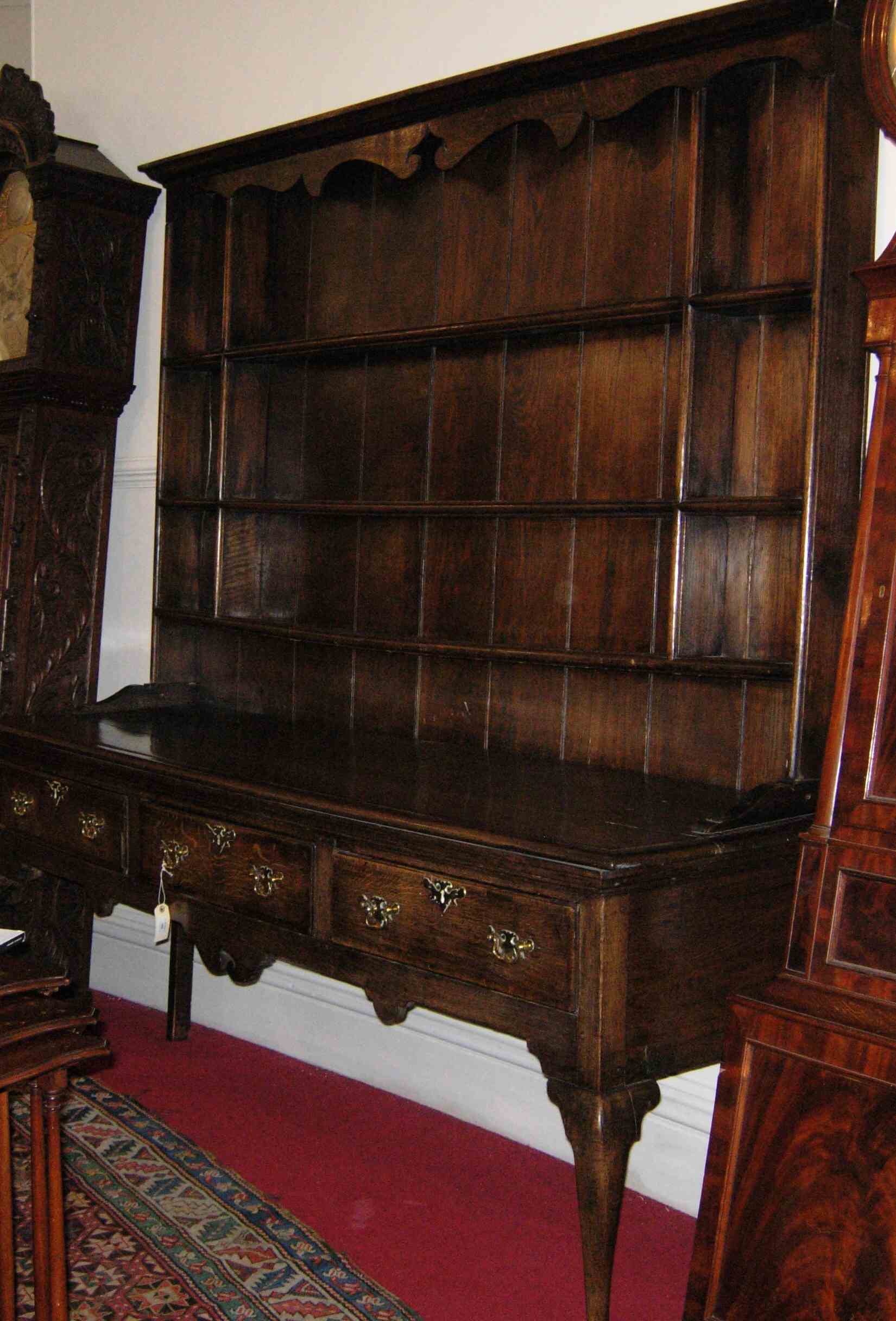 the projecting cornice with scroll carved frieze above open shelves, the top with moulded edge above three frieze drawers and decorative pendants on front cabriole legs with pad feet, adapted