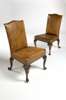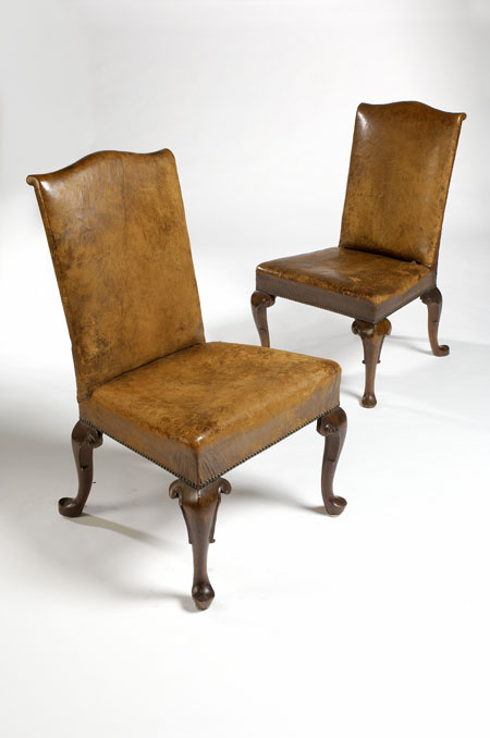 the serpentine crested and overscrolled rectangular backs above stuffover seats, on four scroll-carved cabriole legs ending in pad feet (2)