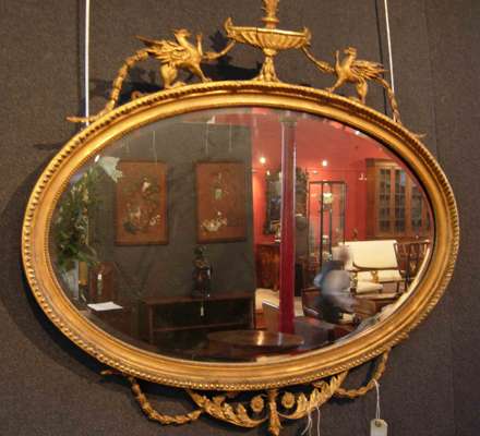 the gadrooned and beaded frame enclosing a bevelled plate surmounted by an urn flanked by griffins, with wired gesso leaf scroll pendant