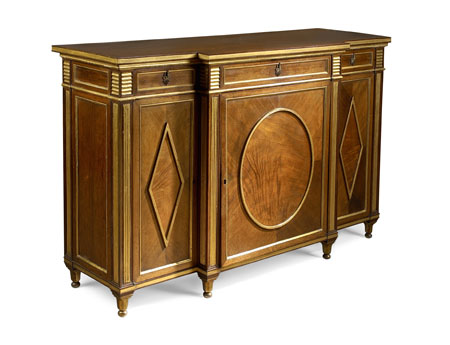 A Regency period rosewood mahogany veneered and parcel gilt breakfront side cabinet