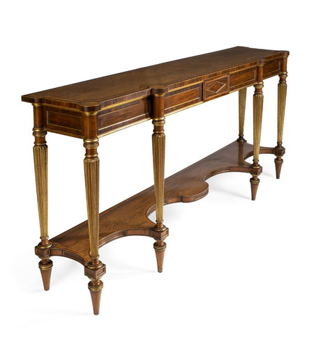 A Regency period walnut, rosewood veneered satinwood crossbanded and parcel gilt side table, circa 1810