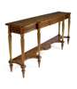 the narrow lobed rectangular top above an entablature frieze, centred by a sunken lozenge, on a turned and reeded tapering legs united by an undulating shelf stretcher on toupie feet