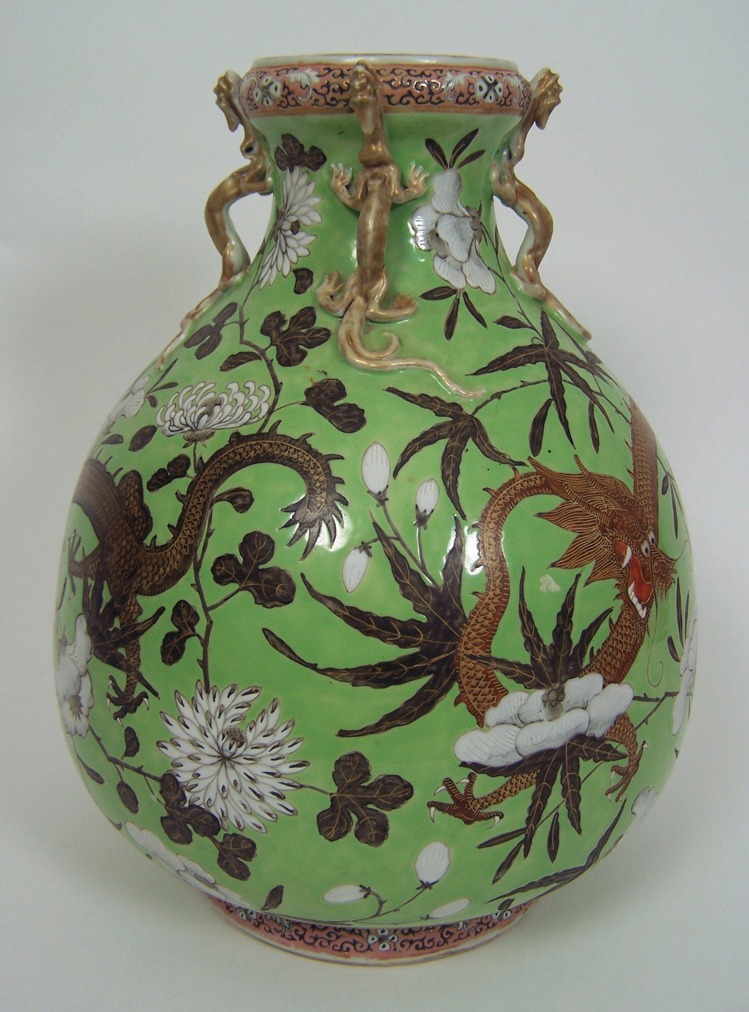 of globular form, with moulded lizards to the neck, decorated with dragons amongst exotic flowers on a green ground
