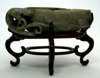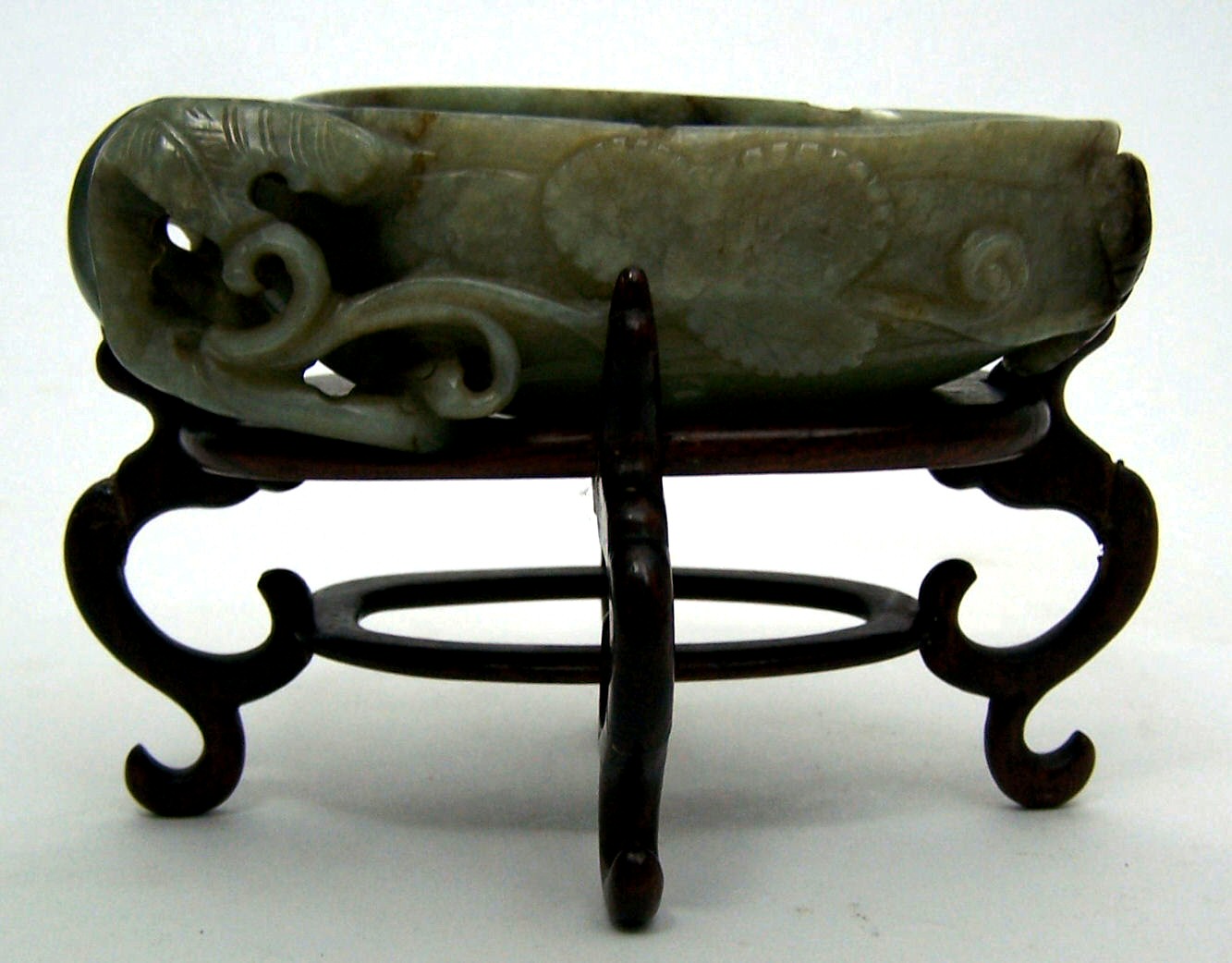with pierced leaf carved handle with further carved leaves around the bowl, on a hardwood stand