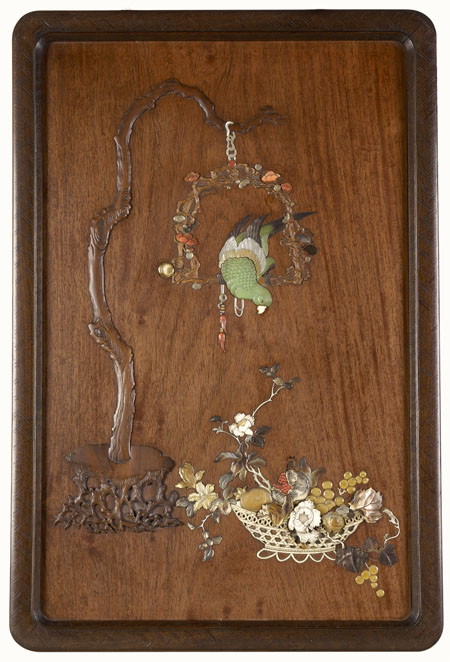 A set of four Chinese wood panels with applied stained ivory, hardstone and abalone shell decoration