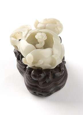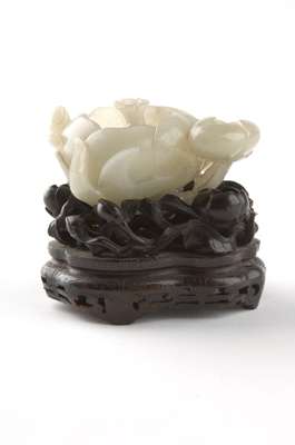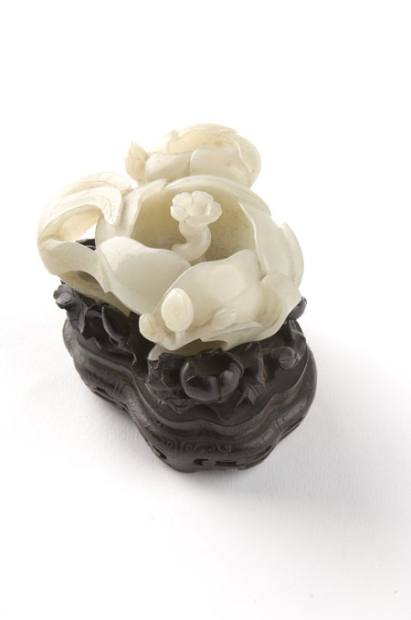the central spirally carved stamen formed as an incense holder, with subsidiary bowl form flowerhead, surrounded by carved leaves