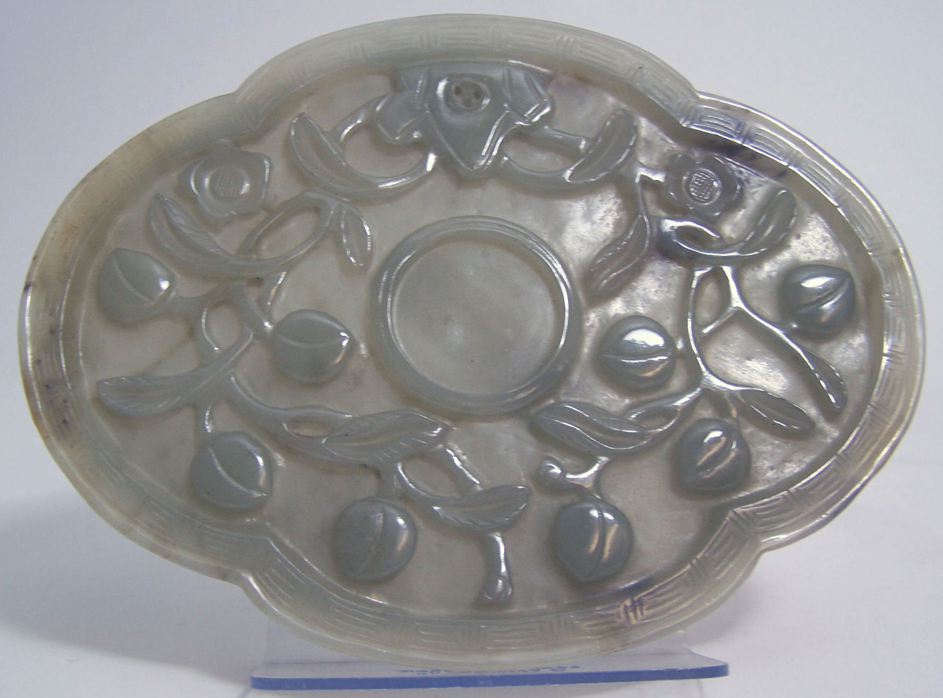 the raised border with engraved Greek key decoration, the centre with deeply carved leaf and buds and central circular well