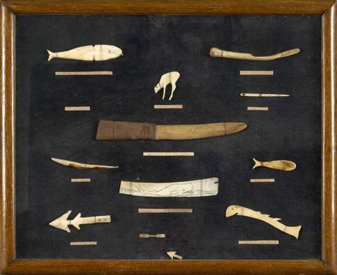 A framed collection of whale bone carvings