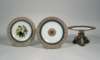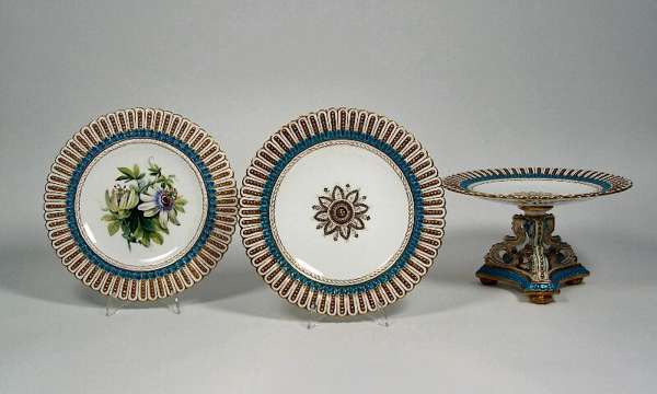 comprising: five tazzae of various heights, each with scalloped rim, with gilt 'jewelled' decoration and turquoise border, the well decorated with a gilt stylised flowerhead and scrolled tripartite base, and another, lacking base; and eighteen similar plates, the well painted with a botanical flower specimen, printed registration mark (24)