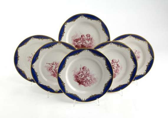 painted in puce with musical trophies and cherubs amongst clouds, against a white ground, the cobalt blue borders enriched with gilt foliate swags, painted gold cross sword mark, underglaze blue BB (6)