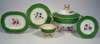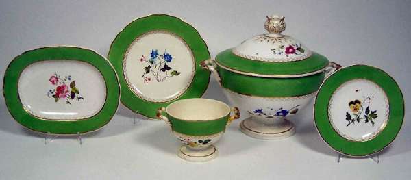 with apple green border, the well decorated with botanical flower studies, comprising: fourteen graduated ashets, largest 43cm wide; four circular tureens, two with covers, 28cm diameter; two circular footed soup tureens and covers, 25cm diameter; sixty-three meat plates; twenty-two fish plates; seventeen soup bowls; and nineteen side plates (qty)