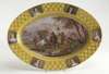 painted with a Louis XIV battle scene, entitled 'PRISE DE COURTAI', and signed Leber, within a turquoise and white fleur d'lys 'jewelled' yellow ground painted with square reserves depicting bust length portraits of Louis XIV and courtiers, interlaced blue L mark