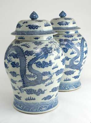 A pair of large 19th century Chinese blue painted vases and covers