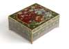 of rectangular form, the central crimson panel decorated with flowering trees songbirds, iwthin a green filigree border, the sides with foliate decoration, above stylised flutes, on ogee bracket feet, the verso also decroation with central monogrammed flowerhead, the interior engraved with Mount Fuji and pavilions