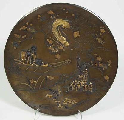 decorated with three figures in high relief, one on the shore and two in a boat, a giltmetal dragon amongst clouds, and with peony blossom tree, signed