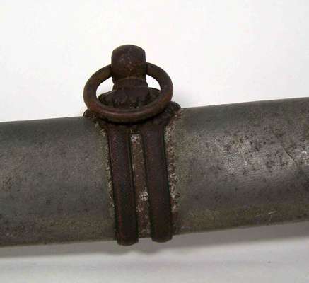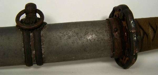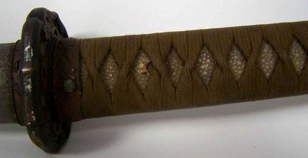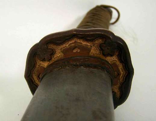 of Daito length with shallow curved single edge blade with irregular zig zag temper line, narrow ridge area, the signed long tang with single rivet hole, the ray-skin grip bound with cord in traditional manner with a menuki (hilt ornaments) of gilt metal prunus flower heads on each side, the tsuba (wrist guard) of gilt metal with a flower head in each corner the Seppas (spacers) stamped with maker's marks, pommel scabbard release button on lower pommel, the scabbard with matching mounts and some remaining surface colour