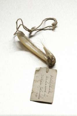 shaped to resemble a fish, the lure is fitted with a piece of carved and pierced fish bone (damaged tip) with hackles of pale goat hair and a length of old twine, with an old label inscribed in brown italics 'Fishing Hook made and used by Pitcairn Islanders 1829'