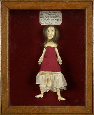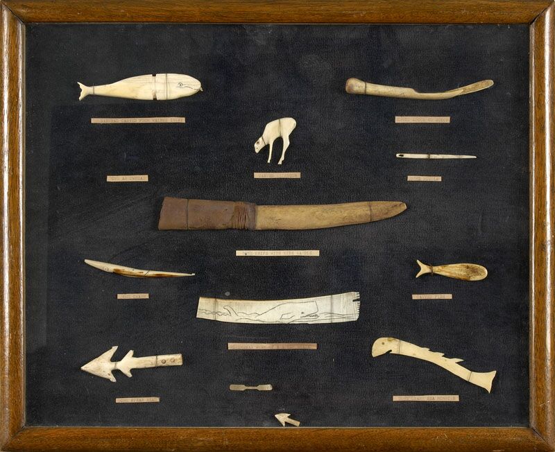 40cm x 49cm; and a framed whale bone carving of a girl (2)