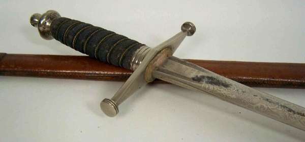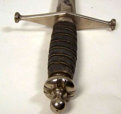 with cross hilt (undress hilt, the full dress basket missing), the fish skin grip bound with a spiral twist of silver wire, with etched double edge broadsword blade with Royal cypher, and 5th Volunteer battalion The Royal Scots, retailed by W. Purves George Street, Edinburgh, in original leather covered field service scabbard