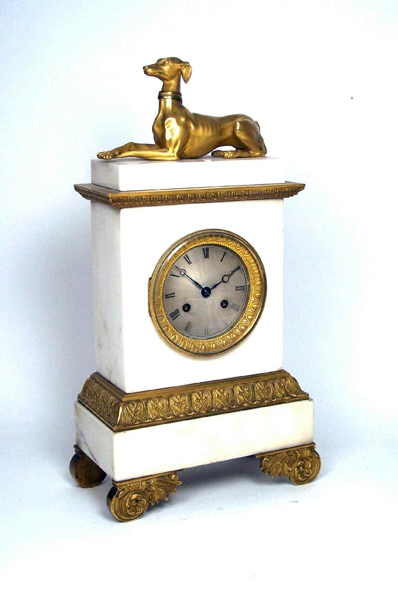 the eight-day movement striking the hours and half hours on a bell with silk suspension, the architectural case surmounted by a greyhound, with leaf cast braces, enclosing engine turned silvered roman dial, the backplate stamped Savory, Paris, on volute scroll feet
