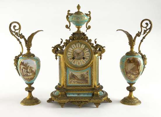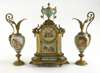 the inset 'jewelled' porcelain panels and dial painted with scenic views and rural scenes, surmounted by an urn finial and raised on toupie feet, flanked by a pair of conforming classical style ewers, raised on socle bases