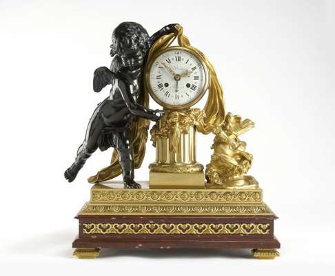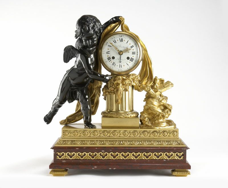 the white enamel dial signed Frd. Berthoud, A Paris, modelled as a cherub supporting the movement atop a fluted classical pedestal, raised on a rectangular rouge marble base with applied mounts and squat toupie feet