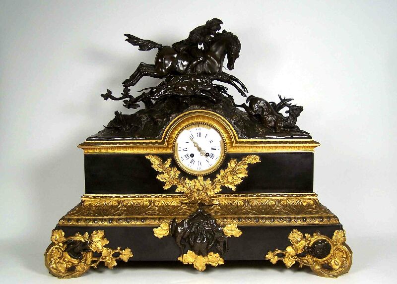 the white enamel dial with Roman numerals and an eight-day movement, surmounted by a patinated bronze group depicting a stag hunt, the stepped rectangular base with applied mounts emblematic of hunting and ending in pierced scroll feet