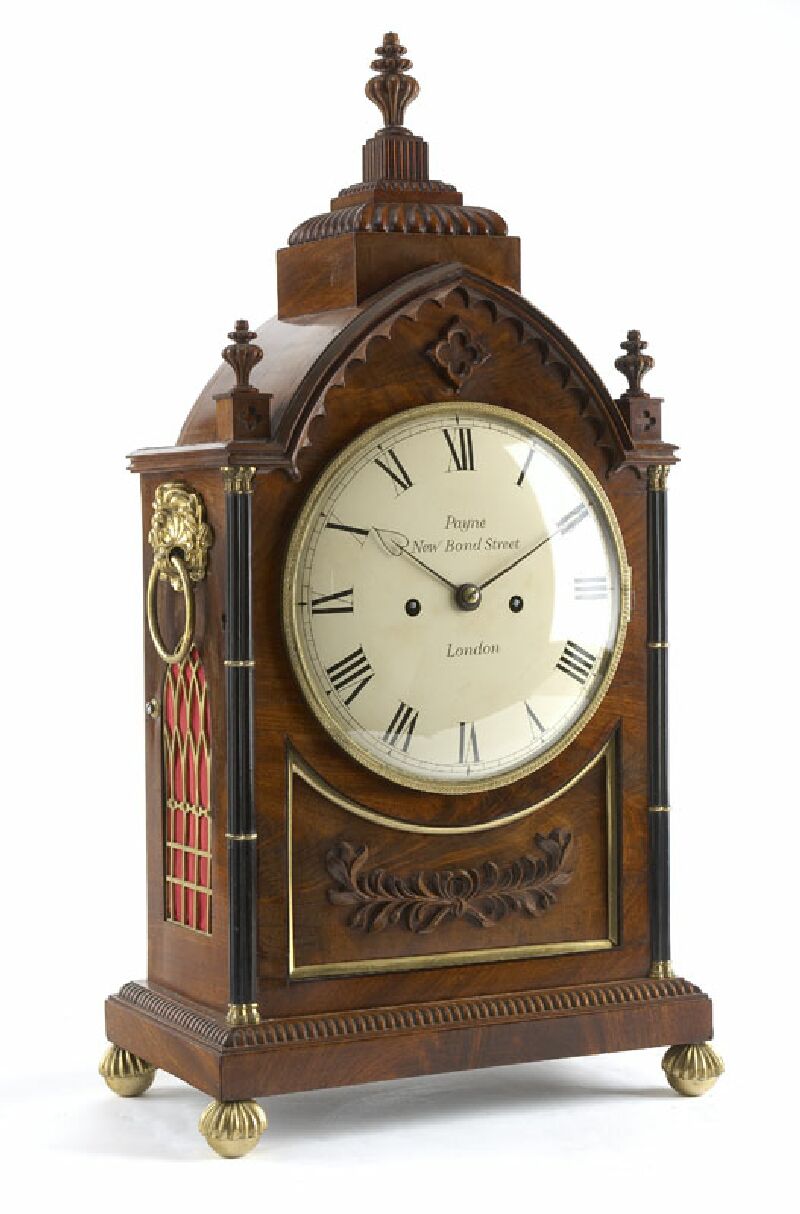 the white painted dial signed Payne, New Bond Street, London, the eight-day twin train fusee movement with anchor escapement and striking on two bells, the arched 'gothic' case, with lobed vase form finials and side sound frets, raised on lobed bun feet