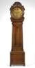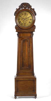 the twin train movement with anchor escapement striking the hours on a coiled gong, the circular hood enclosing a gilt painted dial with Roman chapter ring, the foliate painted centre with subsidiary seconds and calendar dials, signed P. Martin, Glasgow, the tapered case with arched and panelled trunk door between leaf carved captials, on panelled apron with short turned feet