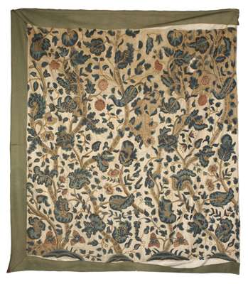 decorated with vertical branches in shaded brown issuing blue leaf palmettes and leaf scrolls with madder rosettes and stylised tulips, mounted on a later twill self coloured backing and edged with a later green fabric slip, comprising two narrow strips and two square portions, the latter each approximately 203cm high x 192cm wide (4)