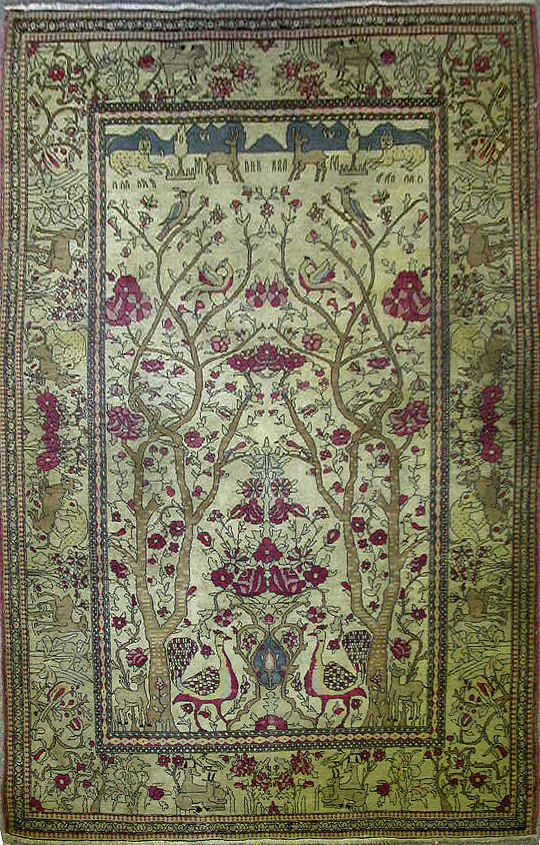 the cream field with double tree of life pattern, with animals, birds and flowers, within a cream animal, bird and floral border between bands