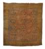 the red field with allover large blue palmete and cruciform motif pattern, within orange rosette and diagonal vine border between bands (reduced and border resewn to one side)